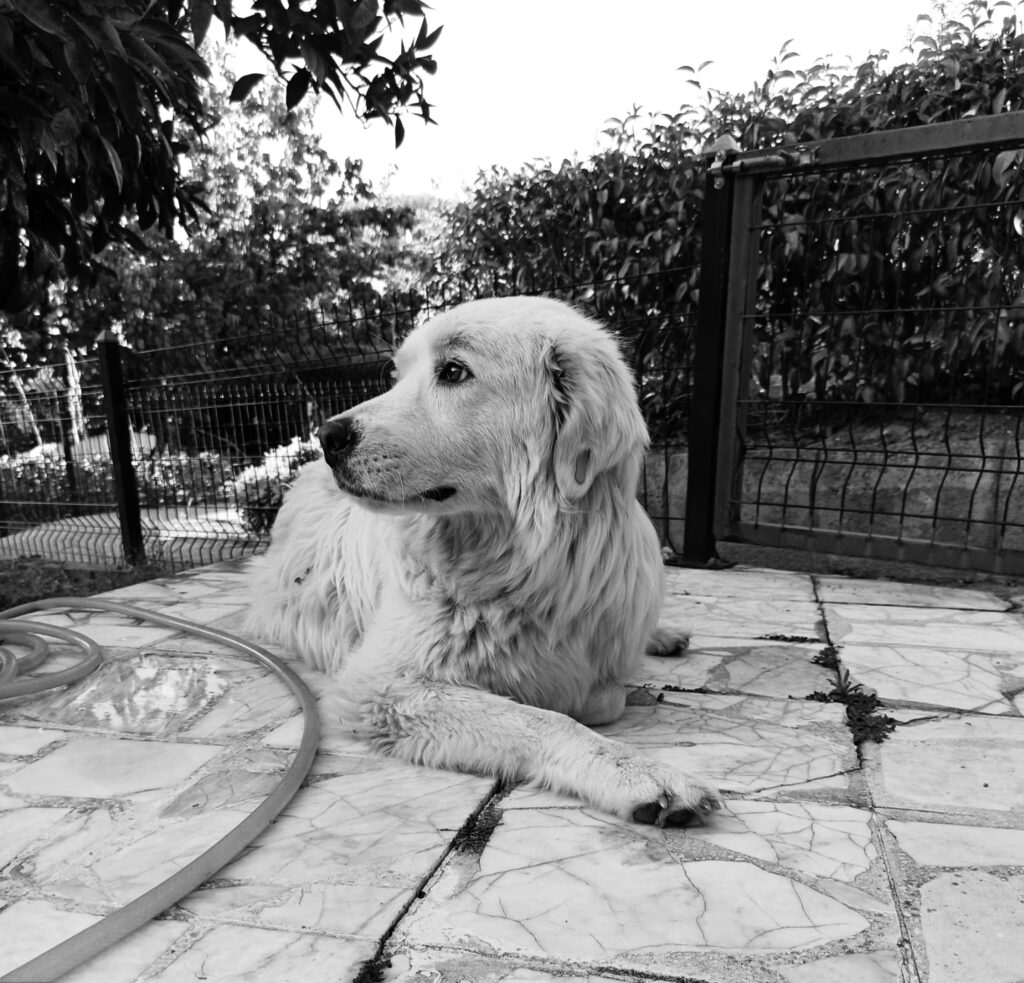 Kalp biçimindeki pembe lekeli burnu ile tanıdığımızda biz Beyaz’ı; yine mevsimlerden yazdı ve bu fotoğraftakinden çok çok gençti, erişkin dahi sayılmazdı. Kulağında küpesi bile yoktu. Aidiyetini zorunlu olarak deniz, kum ve yazlıklardan oluşan dış mekâna kaydırmıştı ve ayakta durabildiğine göre de bunu benimsemişti. Üstelik ayrıca benimsediği ve yönettiği bir hâl daha vardı. Kendine dair aidiyetler de edinmişti Beyaz. Bu fotoğraftaki bahçemiz gibi. Bizimle bağ kuran, çocuklarımıza gecenin karanlığında evimize kadar eşlik eden, bir tehdit algıladığında önümüze düşen ilk önce hep o oldu. Aradan geçen yıllar boyunca her gidiş-dönüşte yakınımızda belirmesi, salladığı kuyruğuyla gövdesinin yapısına uygun biçimde salına salına bahçe kapısının önündeki taşların üzerine kurulması, karnını doyurduktan sonra yine aynı ritimde ertesi gün batımına kadar ortadan kaybolması; bütün bunların hepsi onun duyduğu aidiyet hâlinin göstergesi hatta ritüeli diyebiliriz.